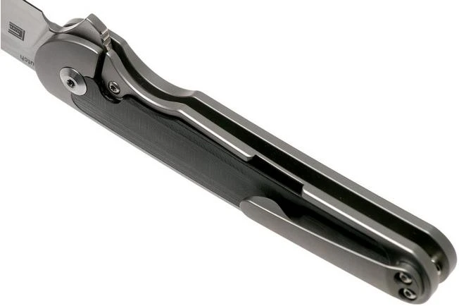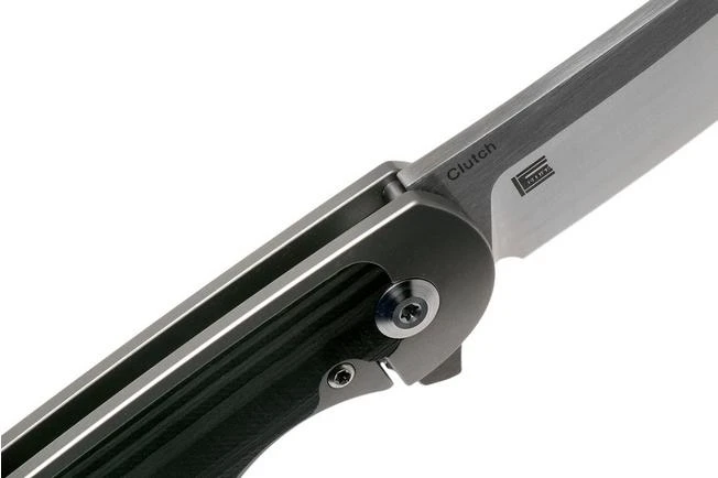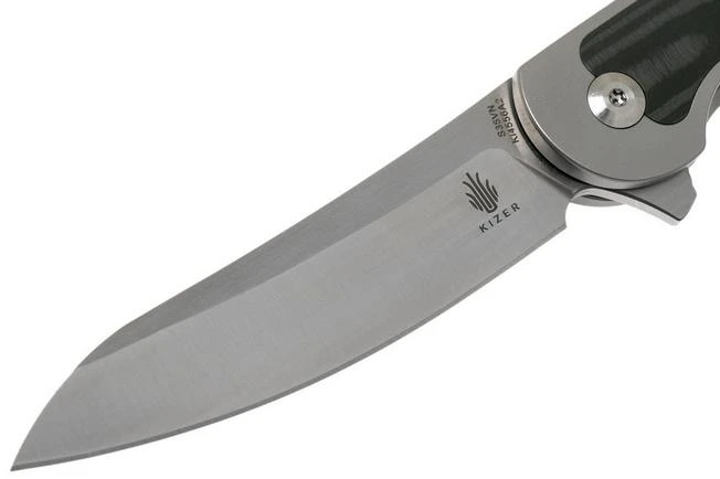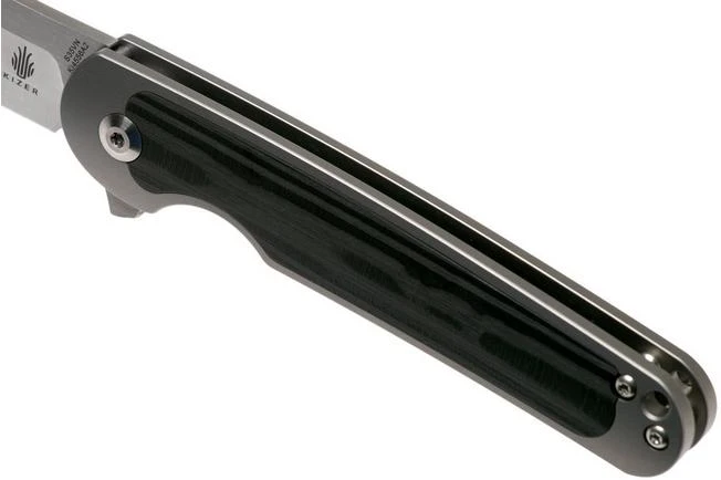 The Kizer Clutch Ki4556A2 is a slim and light-weight EDC pocket knife, designed by Carlos Elstner. It may be slim and light-weight: 8.6 cm is not small at all. The handle is stunning. The nicely rounded titanium, combined with the carbon fibre inlay looks amazing. The inlay nicely fits inside. The great thing about the carbon fibre is that it is uni-directional. Not woven, but layers on top of each other all facing the same way.